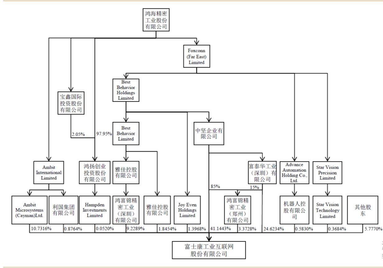 鸿海精密/富士康/富士康工业互联网股份有限公司(工业富联)之间股权关系复杂。本图信息截至2017年12月31日,数据来源:天风证券