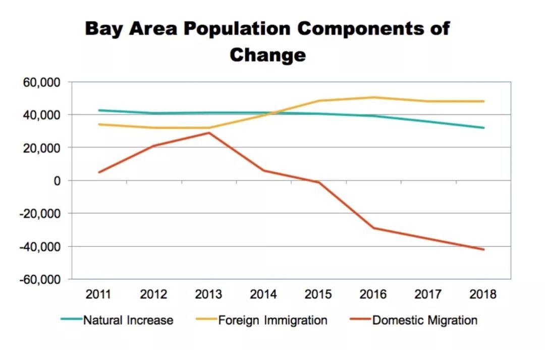 地区政府和社会组织发布的调查问卷中,几乎每一份都透露了当地居民强烈的迁出欲望。去年湾区人口只增长了约3.8 万人,是 2011 以来最少的一次。在人口结构上,外国移民占迁入大头,其次是自然增长,而本土迁入的居民则为负四万多。