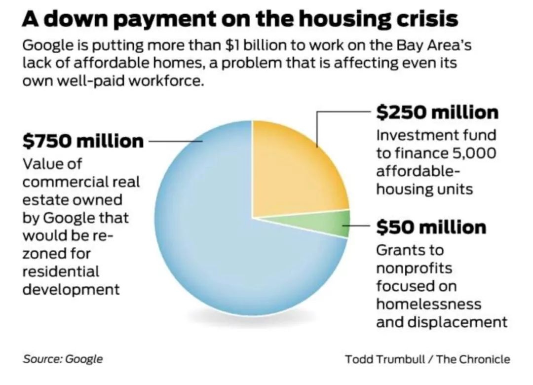无论是从追求盈利的属性,还是与社区天生对立的角色定位来看,指望大公司解决社会问题是不现实的,他们最多只能作为榜样或者参与者。按照估计,提供与湾区市场需求相匹配的可负担性住房需要每年投入 15 亿美元,一年的资金要求就超过谷歌这次的十年计划。