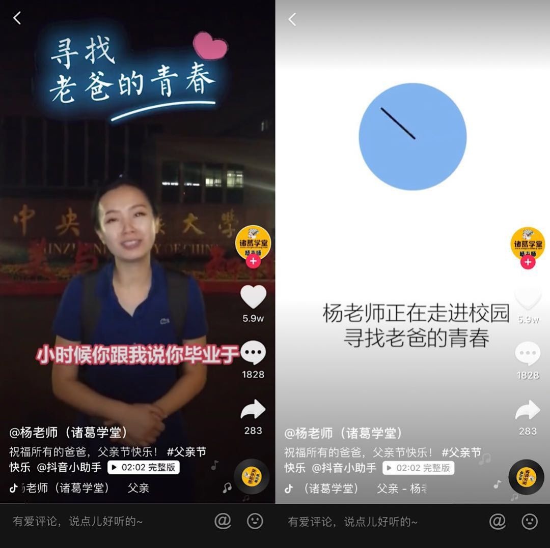 真人出镜的账号又分为个人账号与官方账号,像「杨老师(诸葛学堂)」就是典型的个人账号,即打造具有个人风格的账号。除了发布教学内容,她还会发布自己的vlog视频。最近的爆款视频是她在父亲曾经毕业的母校里,寻找父亲的青春。发布时间正好在父亲节,引发了很多粉丝的共鸣。