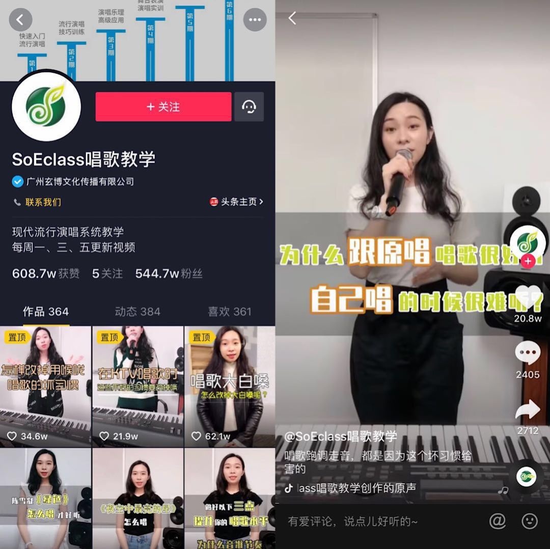 而真人出镜中的官方账号则更偏工具型,倾向于展示教学场景,例如「SoEclass唱歌教学」一直都是由一位女老师出镜,每期视频教一个唱歌技巧,偶尔会发布一些老师上课教学的视频。