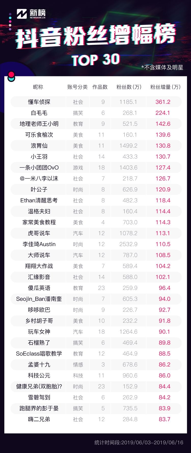 ps. 以下是第9期“抖音达人粉丝增幅榜TOP30”完整榜单,来看看最近两周还有哪些抖音增长红人: