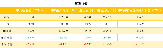 etherchain.org数据显示,目前平均挖矿难度 2023 T,环比微涨 1%;平均算力 157.9TH/s,环比上涨 14%;