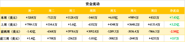 资金方面,本周资金波动较大,周二净流出资金最多,超过 7 千万美元;周五净流入资金较高,达到 7 亿美元。
