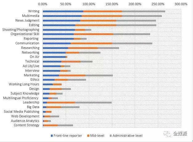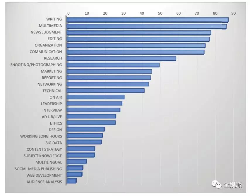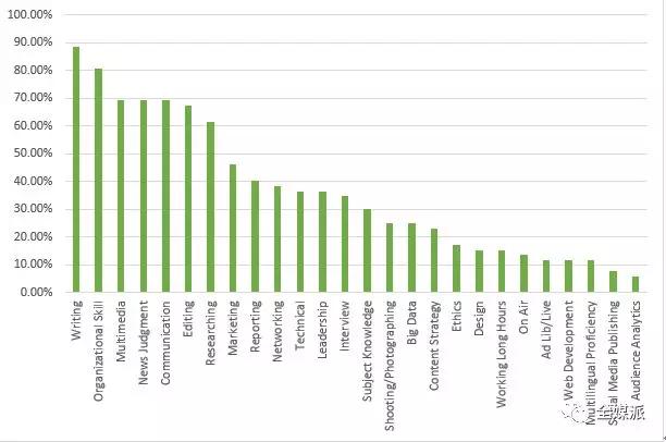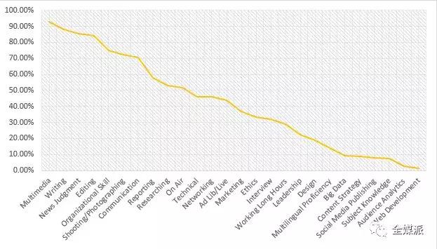 然而,不能否认媒体仅重视文字等传统技能的时代已经结束,其对从业者多媒体技能,包括全媒体采编(Multimedia)、操作编辑部多种软硬件设备(Technical Skill)、设计(Design)、大数据分析(Big Data)、网络开发(Web Development)、社交媒体运营(Social Media Publishing)及受众分析(Audience Analytics)等的要求也愈发广泛及详尽。