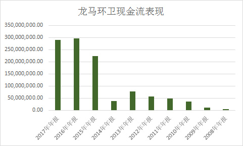 因此尽管利润微薄,但是龙马环卫收入十年中增长了20倍,在资产量高速周转之后,龙马环卫始终保持了较高的净资产收益率。而与之对应的则是龙马的现金流的高速增长: