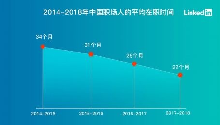 根据领英2018年发布的中国职场人跳槽趋势洞察和《2018中国人才招聘趋势报告》显示,中国职场人的平均在职时间,已经从2014-2015年的34个月(近3年),缩短到了2017-2018年的22个月(不到2年)。