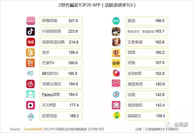 即使对于还未工作的Z世代来说,社交媒体也无法再独获恩宠。如今,社交app要与电视剧、音乐、手游、短视频和动漫app一同来争夺Z世代的上线时间。在Z世代洞察报告中,QuestMobile统计了Z世代偏爱Top20 App: