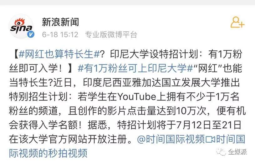 最近,“有1万粉丝即可上印尼大学”的新闻也闹得沸沸扬扬。印尼大学宣称,若在Youtube上拥有1万粉丝且影片点击量达到10万次,即可获得入学名额。虽然网络上对该种招生持鄙夷态度的人居多,但可以发现,经营社交平台正在从休闲娱乐过度成某种被社会认可的事业。每一个赞和每一个关注,都是发布者的功勋。