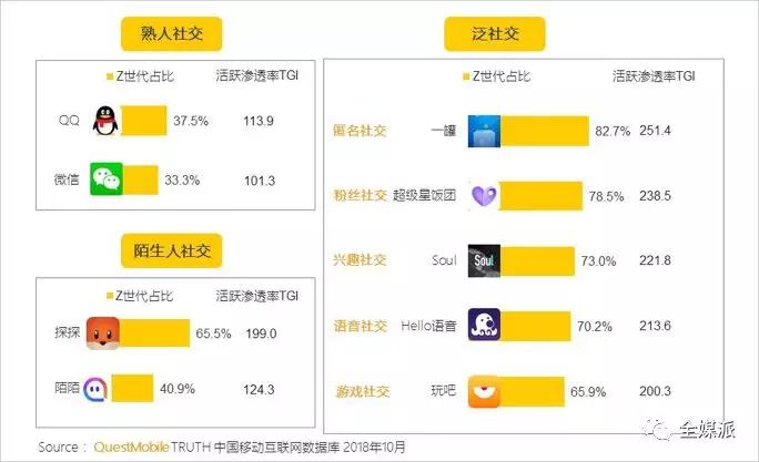 而国内的Z世代也不弱。在更新“官方”日常动态、建立自身人设时,他们要根据动态的“调性”去仔细选择相对应的平台:“朋友圈中元气满满,豆瓣上岁月静好,微博里要死要活。”而当想展现真实自己时,他们也默默离开主流平台。Questmobile 2018年底发布的Z世代洞察报告显示,Z世代对于参与泛社交有极大兴趣: