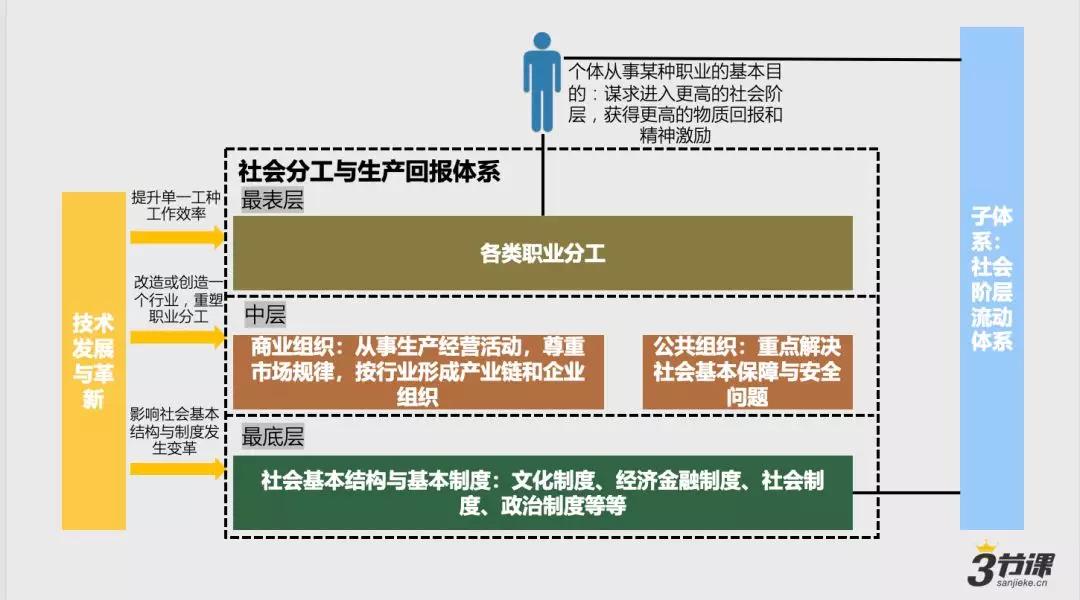 整个大体系中,我们作为个体从事某种职业进行生产活动,而基本目的则往往是为了谋求进入更高的社会阶层,获得更高的物质回报和精神激励——这又从属于社会基本结构和制度中的某个子体系:社会阶层流动体系,人们在这个体系中通过自己的付出和成长获得更多回报,从而实现所谓“个人进阶”、“财富自由”等常见目的和追求。