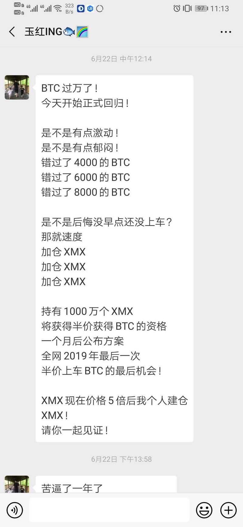 接下来几天,XMX 创始人玉红开始在社群疯狂喊单,每日群发消息,并承诺 XMX 在翻 5 倍后自己会建仓。