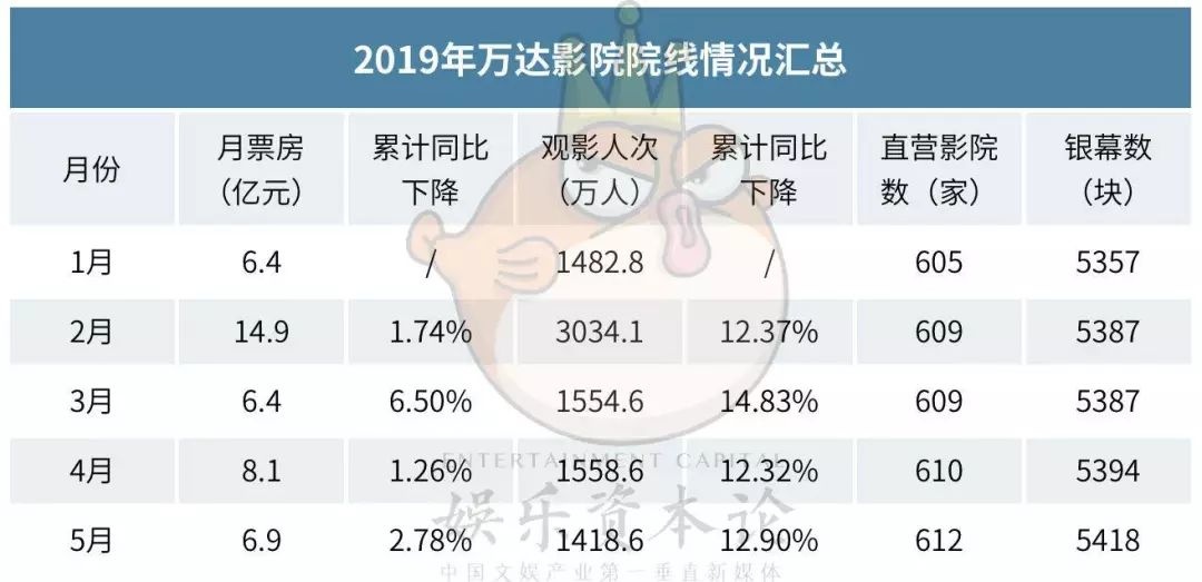 小娱查看了国内规模和营收排名第一的万达院线2019年的经营简报,发现虽然新的影院不断建起,但它们每个月的票房成绩与观影人数与去年相比呈急剧下降的趋势。