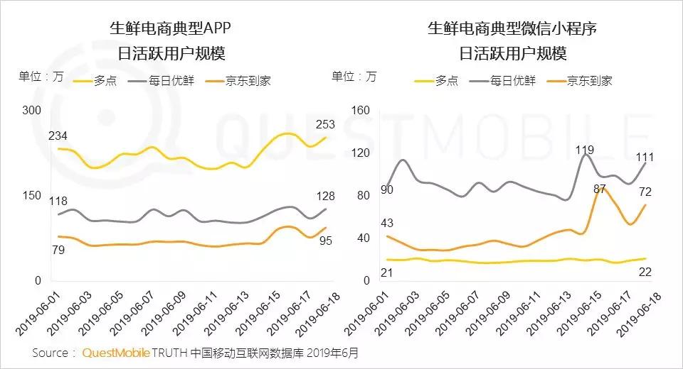 2、多点将流量集中在APP上,6月18日达到日活阶段峰值;每日优鲜和京东到家则利用全景渠道多处开花