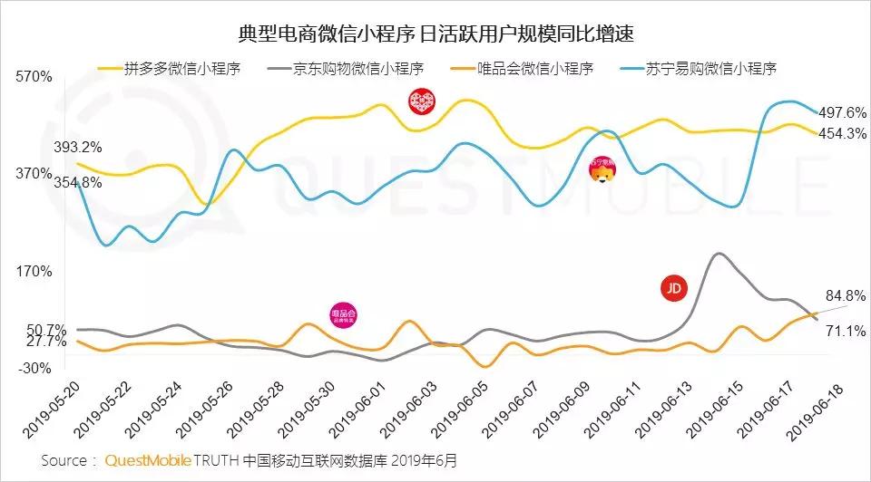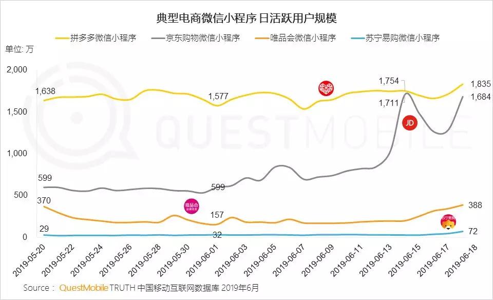 3、微信小程序也在助力电商618,京东借大促活动,对微信流量的利用效率显著提升,京东购物小程序的日活在618当天较520大增近2倍,量级已接近拼多多