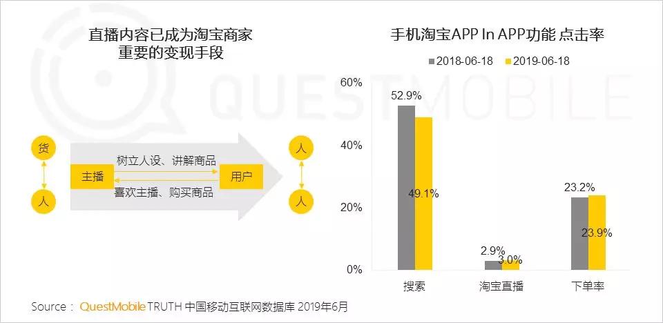 2、淘宝直播已占据APP内部3%的点击流量,直播红人帮助淘宝从“货与人” 向“人与人”转变,红人、货、消费者之间的关系愈发紧密