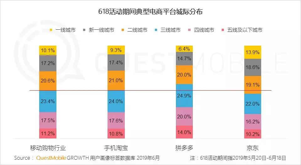 本次大促,52%的手机淘宝用户和48%的京东用户坐落在三线及以下城市,头部电商在下沉市场已取得一定成效。