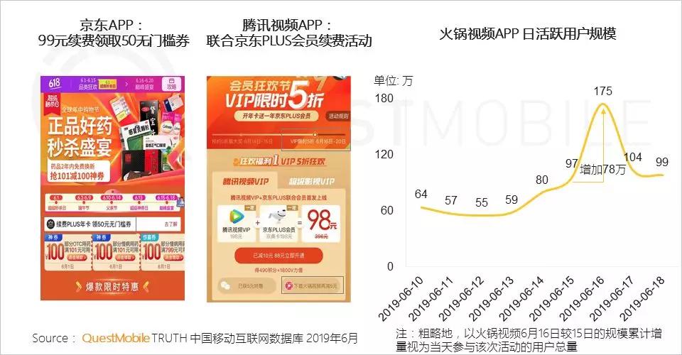 6、同时,今年618期间京东通过多种途径扩充付费会员权益,刺激用户续费;与腾讯视频进行权益打通,粗略估计,在6月16日当天,至少有80万用户通过该通道完成续费