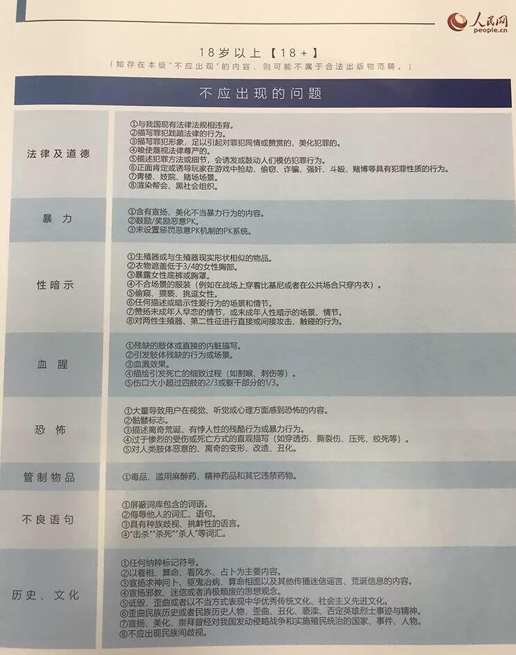内容上采用负面清单形式。如果存在本级不应出现的内容,则可能不属于合法出版物。例如在18+一级里的产品存在“鼓励/奖励恶意PK”,即视为出现“暴力”,或者6+一级里的作品出现性暗示,就都不符合标准。