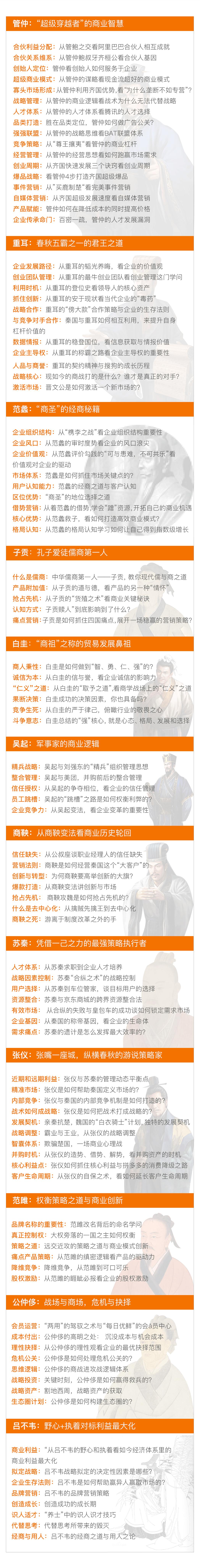 比如吴起的精兵战略对标刘强东的“精兵”组织管理思想、范雎的缜密逻辑对标可口可乐的降维竞争、 公孙侈的“两用”驾驭之术对标每日优鲜的会员中心体系......等等;