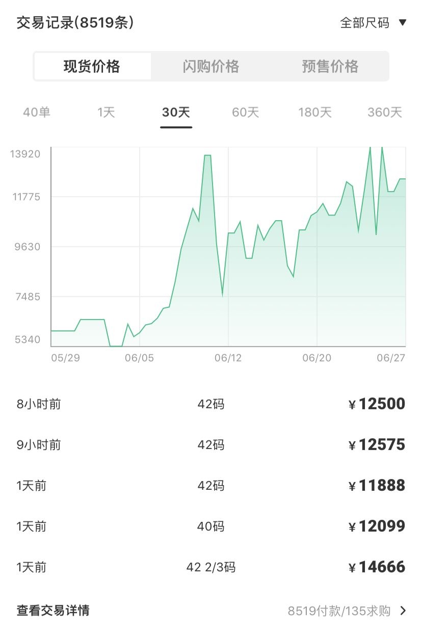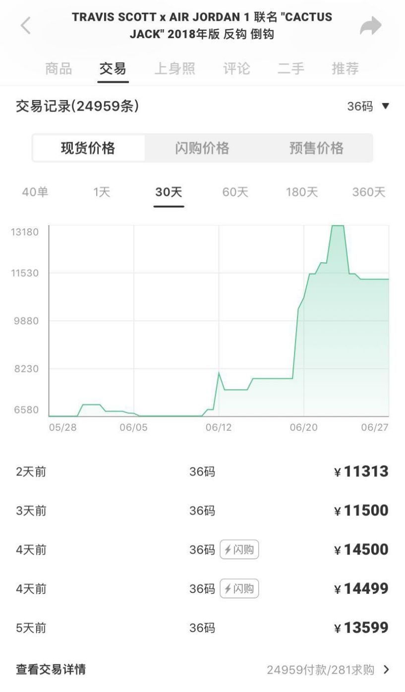 娱sir注意到,在某平台上,目前求购倒钩的价格的确已经突破万元,女版黄金码(男款:40-45码、女款:36-37.5码)36码甚至一度涨到14500一双,价格涨幅最大的时间段是6月20日到27日之间,而在这期间的21日,《中国新说唱》播出了第二期节目。