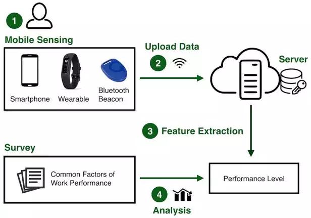 然后,手机、手环的数据都会被传到公司的云服务器内,已经被训练识别员工不同信息的机器学习算法将对此进行处理,并作出最终的绩效评定。