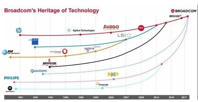 众所周知,博通之所以有今天的规模,少不了不停收购的功劳。其四大业务部门(有线通讯基础建设部门、无线通信部门、企业存储业务以及其他产品部门)就不乏是通过收购而赢得了巨大的市占率。