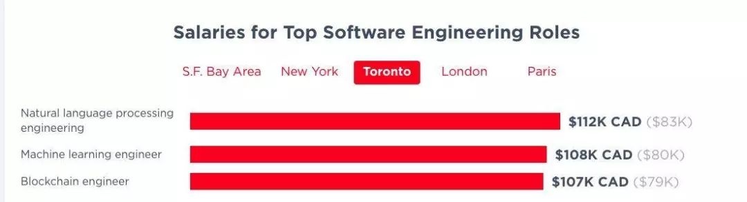 美国技术从业者的平均薪资要高于世界平均水平,为 13.5 万美元,整体来看,东海岸的薪资增长速度要更快。2019 年,旧金山湾区已经连续第四年成为技术工作者收入最高的就业市场,平均薪资为 14.5 万美元,去年的工资增长率为 2%,考虑到其飙升的租金和丰富的技术成果,这并不令人感到意外;多伦多是美国技术从业者收入最低的就业市场,平均薪资为 10 万美元,不过,去年的工资增长率还不错,为 9%。