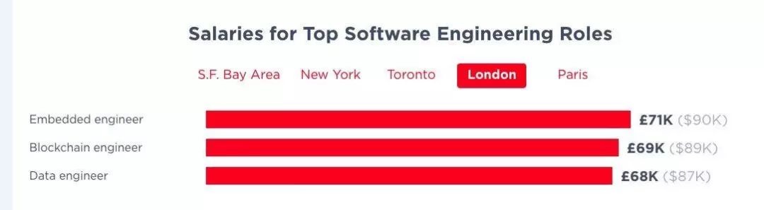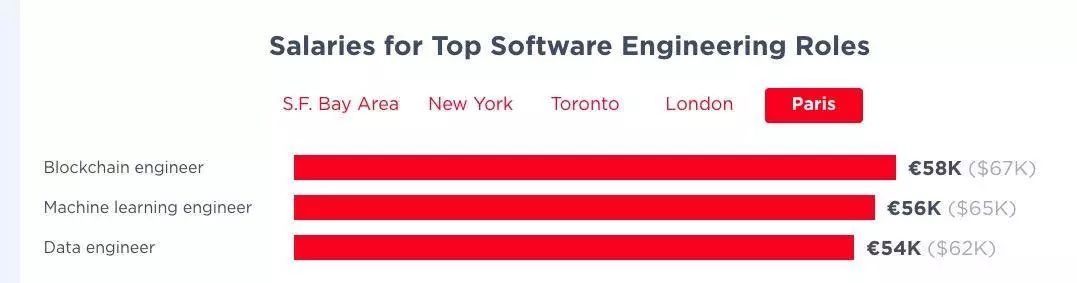 2019 年,法国巴黎的技术从业者的平均薪资为 5.2 万欧元,去年的工资增长率为 8%;英国伦敦的技术从业者的平均薪资为 6.2 万英镑。