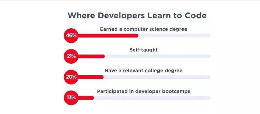 不再追求高学历并不意味着在知识的获取上止步。如今,技术工作者正在研究其他形式的学习方法。根据 《2019 年软件工程师状况报告》,创新型公司正在以更加积极开放的心态去看待其他形式的教育,编程培训机构逐渐成为高等教育以外的合理选择。报告中,76% 的受访者认为参加编程培训机构可以为程序员的职业生涯做准备。57% 的招聘经理也愿意为编程培训机构的毕业生提供开放性岗位,仅 7% 明确表示不会聘用。在伦敦的就业市场,更多公司倾向于聘请曾参加过培训或具有在美国市场工作经验的软件工程师。从下图可以看到,选择自学编程的百分比仅次于获得计算机科学学位,未来这一差距可能还将继续缩小。
