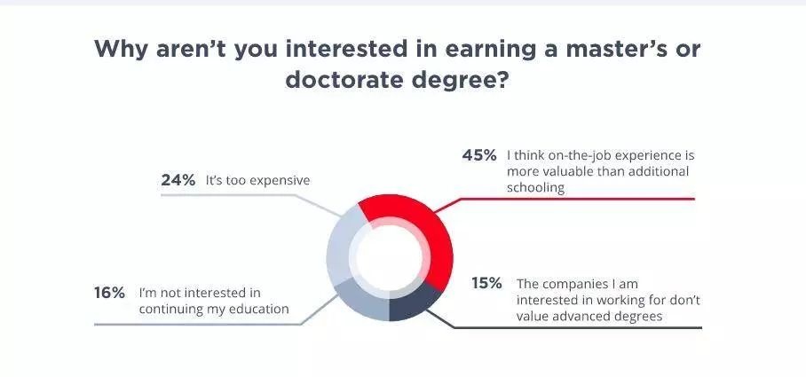 调查结果显示,31% 的受访者认为没有硕士 / 博士学位同样可以获得目前的岗位。48% 的受访者认为高学历为求职带来帮助,其中,仅有 23% 表示高学历为其带来了更高的薪水。受现实条件影响,求职者继续深造的意愿正在降低,超半数(54%)的受访者表示没有兴趣继续攻读硕士 / 博士学位。而选择放弃继续深造的原因主要正在于,相对于在校获得的专业知识,公司更看重实际工作经验的积累,而用人单位对人才的选拔也不再“唯学历”。