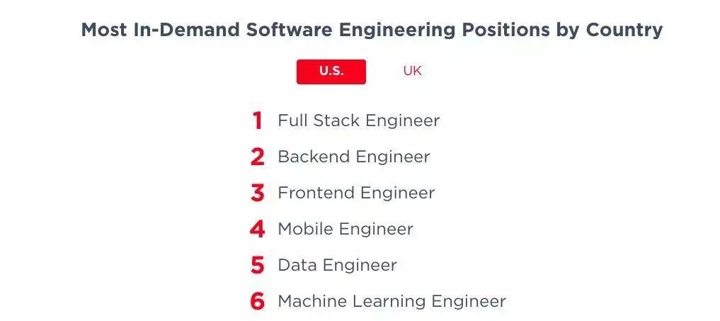 现在看来,对顶级技术工程师的需求不会很快放缓,但具备某些特定技能的程序员可能在需求匹配度及职业生涯发展中更为顺畅,那么哪一类技术人才最受欢迎呢(以美国和英国为例)?具体而言,全栈开发人员是美国最受欢迎的开发人员,而后端工程师在英国则最受欢迎。
