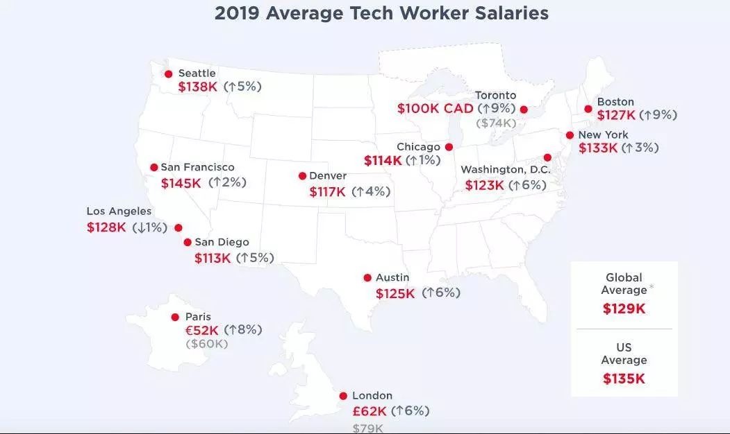 2019 年,全球技术从业者的平均薪资为 12.9 万美元。