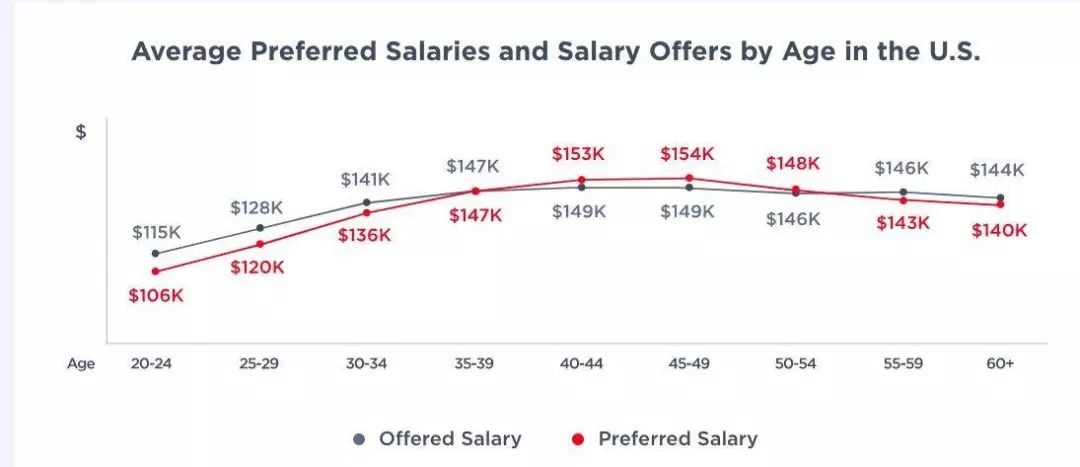 该报告还揭示了科技圈中的潜在的“年龄歧视”问题。在调查数据中,40 岁以上的美国技术工作者的平均工资水平虽然仍普遍较高,但基本不再增长,且呈下降趋势。下图为美国不同年龄段的科技工作者的实际工资与预期工资的对比。