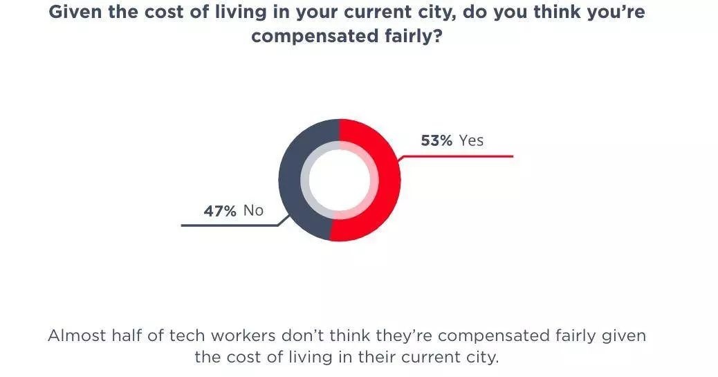 尽管拿着高薪,但因为生活成本太高,房地产价格居高不下,刨去这些生活成本后,很多科技从业者对自己到手的“可怜”的薪水满足感和幸福感并不高,53% 的从业者认为,考虑到他们目前所在城市的生活成本,所得薪酬并不公平。甚至有很多人为了减少生活成本以及避免高额税收会考虑换到别的城市工作。报告显示,60%的科技人才计划在 5 年内离开现有城市,奥斯汀、西雅图、阿姆斯特丹、洛杉矶、丹佛是科技人才们理想的搬迁目的地 TOP5。