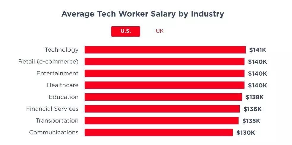 报告显示,在科技行业,美国的公司给出的平均薪水是最高的,为 14.1 万美元。在美国,通信和运输行业的技术从业者的薪资最低,工资平均分别为 13 万和 13.5 万美元,通信行业的薪资还有较大的增长空间。