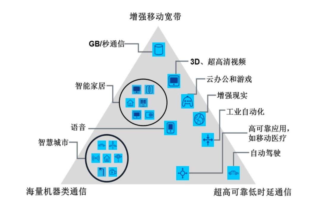 国际电信联盟ITU召开的ITU- RWP5D第22次会议上,确定了未来5G应具有的三大类使用情景:增强型移动宽带eMBB、超高可靠与低延迟的通信uRLLC和大规模(海量)机器类通信mMTC,前者主要关注移动通信,后两者则侧重于物联网。