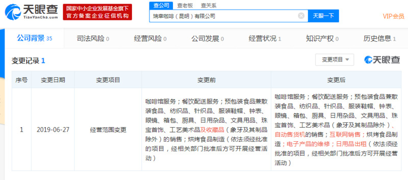 36氪获悉,天眼查数据显示,6月27日,瑞幸咖啡(昆明)有限公司发生工商变更,经营范围新增“自动售货机的销售;互联网销售;电子产品的维修;日用品出租”。瑞幸咖啡(昆明)有限公司成立于2019年2月25日,法定代表人为赵业飞,注册资本500万元人民币,由瑞幸咖啡(中国)有限公司百分百持股,其分支机构达29家。