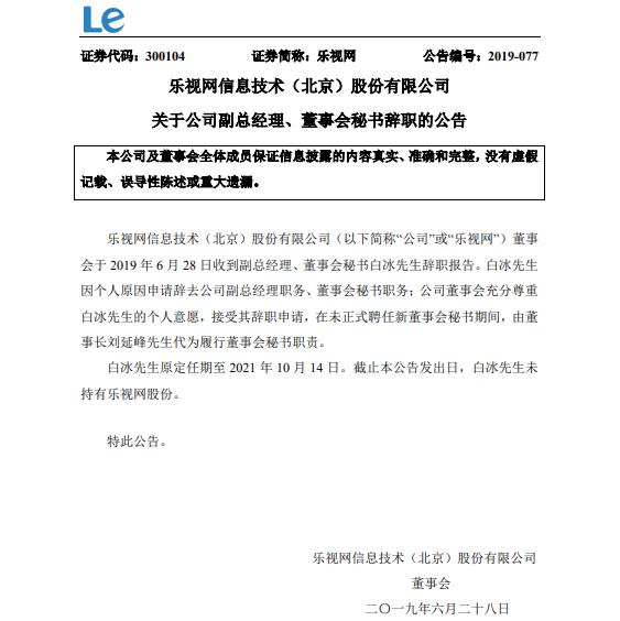 乐视网:董秘白冰宣布辞职,董事长刘延峰代职