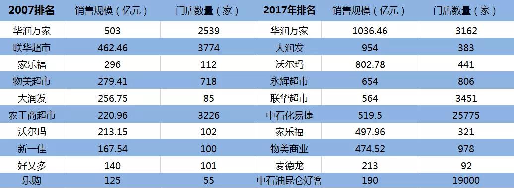 2007年,中国连锁超市十强榜单中,外资超市占据半壁江山;十年之后,2017年的十强榜单中,只剩下沃尔玛、家乐福和麦德龙。