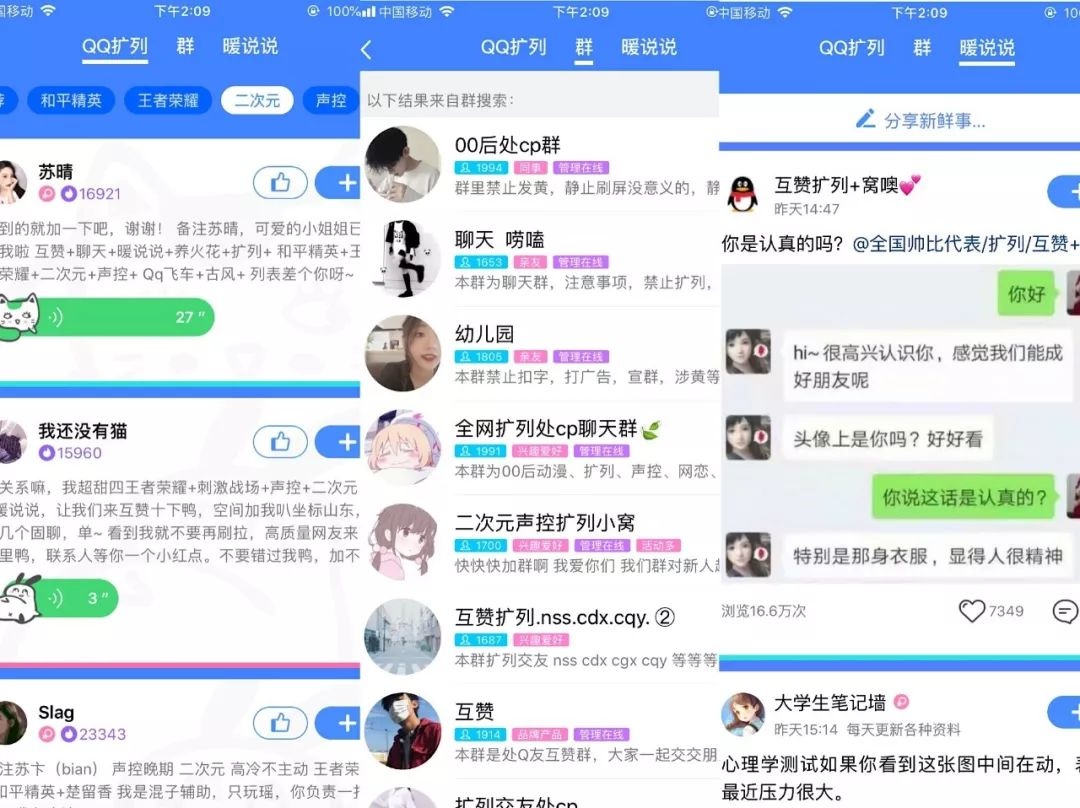 在展开之前,有必要说一下什么叫“扩列”——“扩充好友列表”的简称,就是广交朋友的意思。QQ追求“扩列”的时间成本向零趋进,加陌生人为好友就像微博上关注别人一样简单。在编辑“扩列宣言”,上传“镇楼音”之后,就可以向自己心仪的用户发送好友验证。
