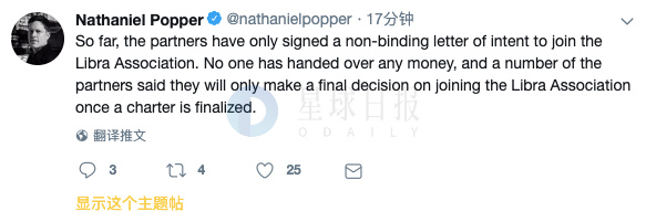 6月26日,纽约时报记者Nathaniel Popper发文称,除了监管机构对Facebook的加密货币心存疑虑,其合作伙伴也是如此。 Popper表示,到目前为止,合作伙伴只签署了一份不具约束力(加入Libra协会)的意向书。目前还没有机构向Libra提供任何资金,一些合伙人表示,他们只有在章程确定后才会对加入Libra协会做出最终决定。