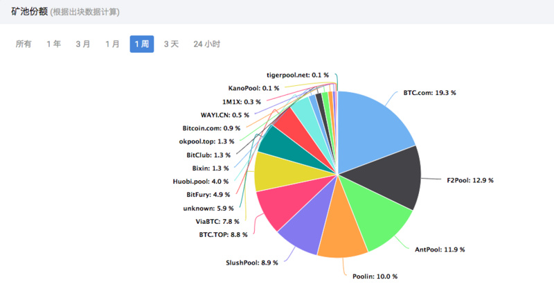 根据矿池出块份额计算,BTC.com 居第一位,占比 19.3%,算力 11.08 EH/s;F2pool 排第二,占比 12.86%,算力 7.87 EH/s;第三名蚂蚁矿池,占比 11.88%,算力 7.26EH/s。紧随其后的是 Poolin和 Slushpool。