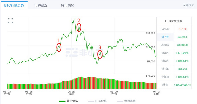 比特币周内单日涨幅最高出现在6月26日(24h涨幅达13.03%)。次日凌晨,比特币触达周内币价高点13881美元,但在继续冲刺14000美元中败北并急速回落,短时跌幅15.7%,之后迅速回升。此后一天进入下跌行情。