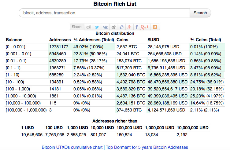 比特币地址中,49.02% 的地址持有共 2493 BTC,占所有币的 0.01%;22.81% 的地址占有全部币量的 0.13%。