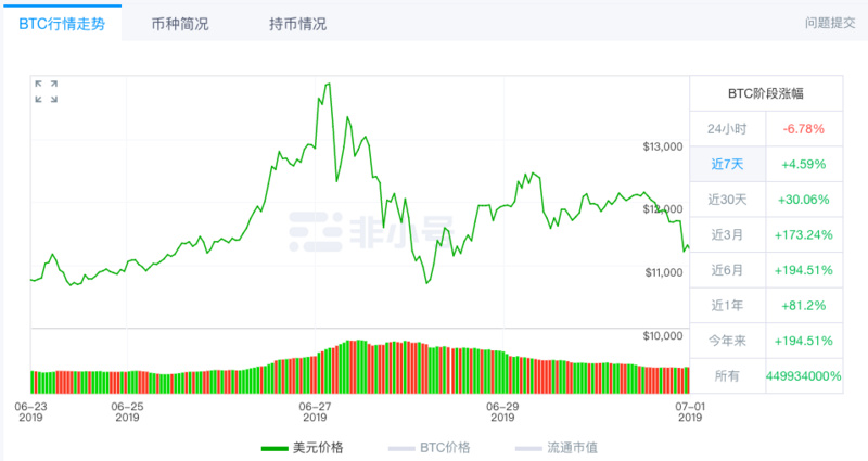 本周比特币价格低至 10557 美元,高逾 13882 美元,周内浮动将近 24%,呈大幅震荡之势;7 日涨幅为 4.59%。
