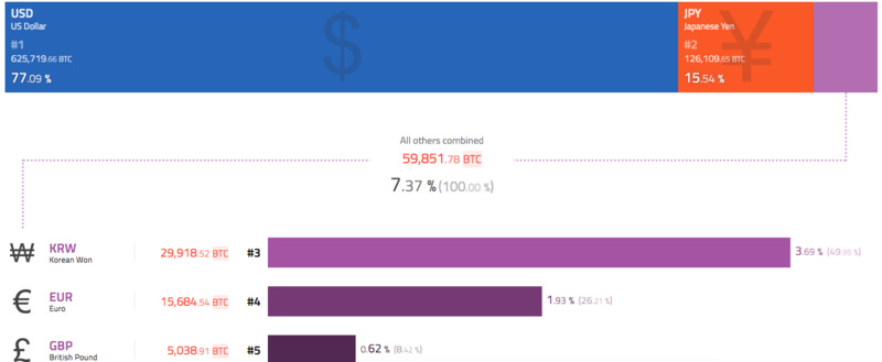 本周比特币兑法币交易中,美元排名第一,占比77.08%,相比于6月初的64.32%,呈大幅上涨;排名第二的日元占比为15.54%,相比于6月初的26.29%,呈大幅下降;韩元排名第三,占3.69%;排名四五位的为欧元(1.93%)和英镑(0.62%)。此前比特币兑法币一直较为活跃的土耳其里拉排名大幅下降,自6月初的1.21%下降至本周的0.12%。