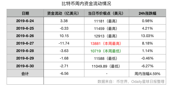 Odaily星球日报整理发现,比特币周内呈资金流出趋势,净流出资金 6.56 亿美元,最大单日流出额11.74亿美元,出现在本周币价峰值 13881 美元(同时也是年内币价峰值)的6月27日,次日,比特币最低回调至10719美元(周内低点)。最大单日流入额10.74亿美元,出现在币价连涨三日、并达到周内日间最高涨幅的6月27日。