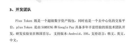 在早期的文字版白皮书中,PlusToken 称自己由三星和谷歌具备多年丰富经验的原技术团队开发,研发实验室在韩国首尔。同时,最初的一份官方宣传材料中提及,其创始人是谷歌阿尔法狗算法研究员 LEO,联合创始人为三星团队核心技术金钟仁。PlusToken 号称,谷歌和三星占其股 17%。