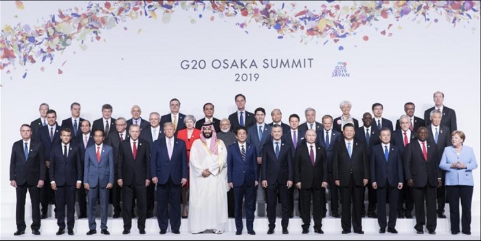 上图:二十国集团领导于 6 月 28 日在大阪举行的峰会上合影留念